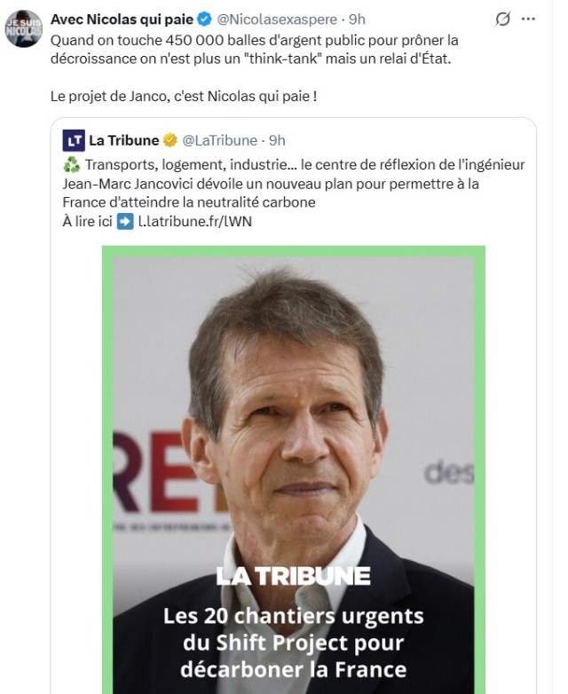 Quand on touche 450 000 balles d’argent public pour prôner la décroissance on n’est plus un « think-tank » mais un relai d’État.Le projet de Janco, c’est Nicolas qui paie !