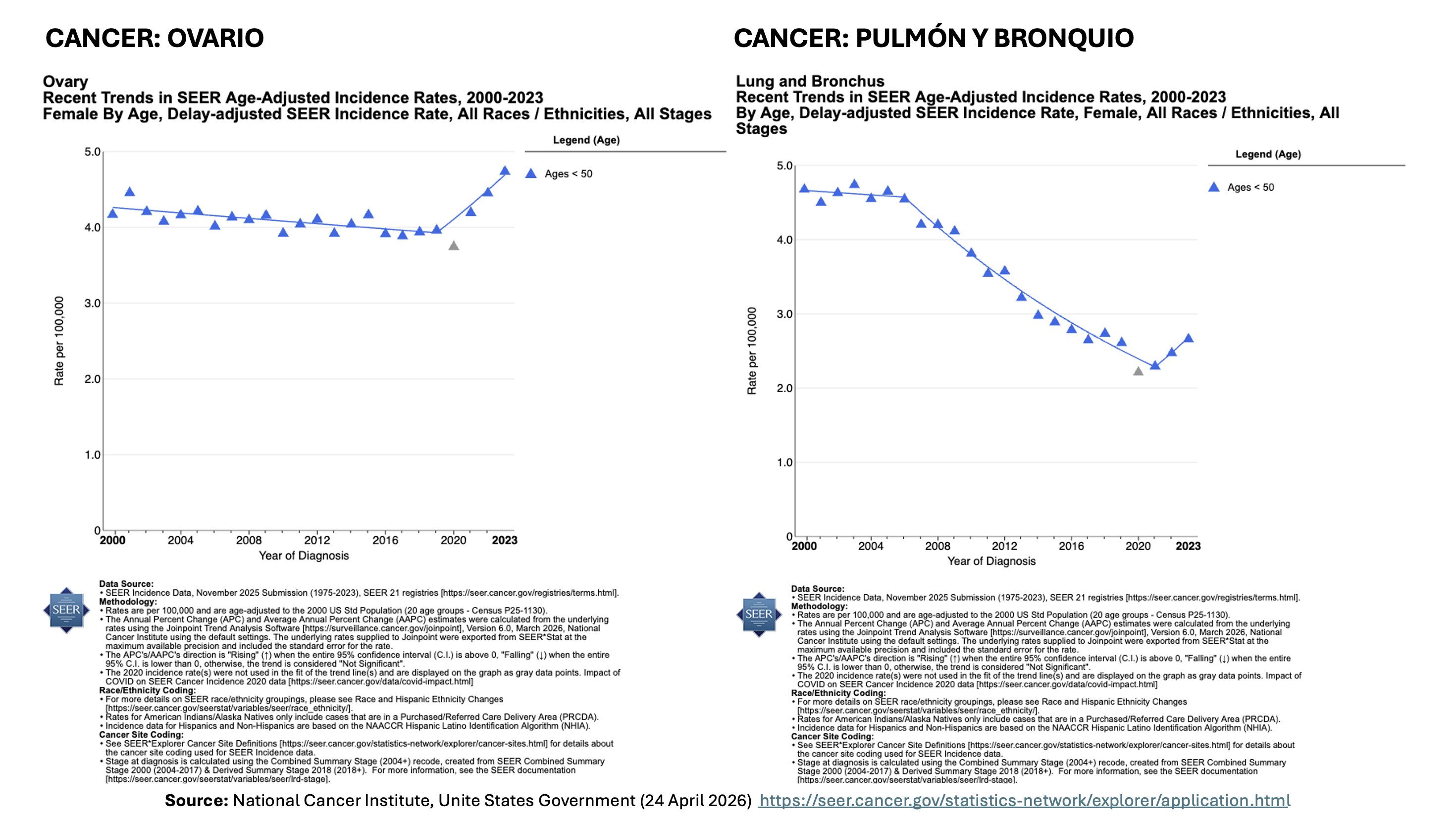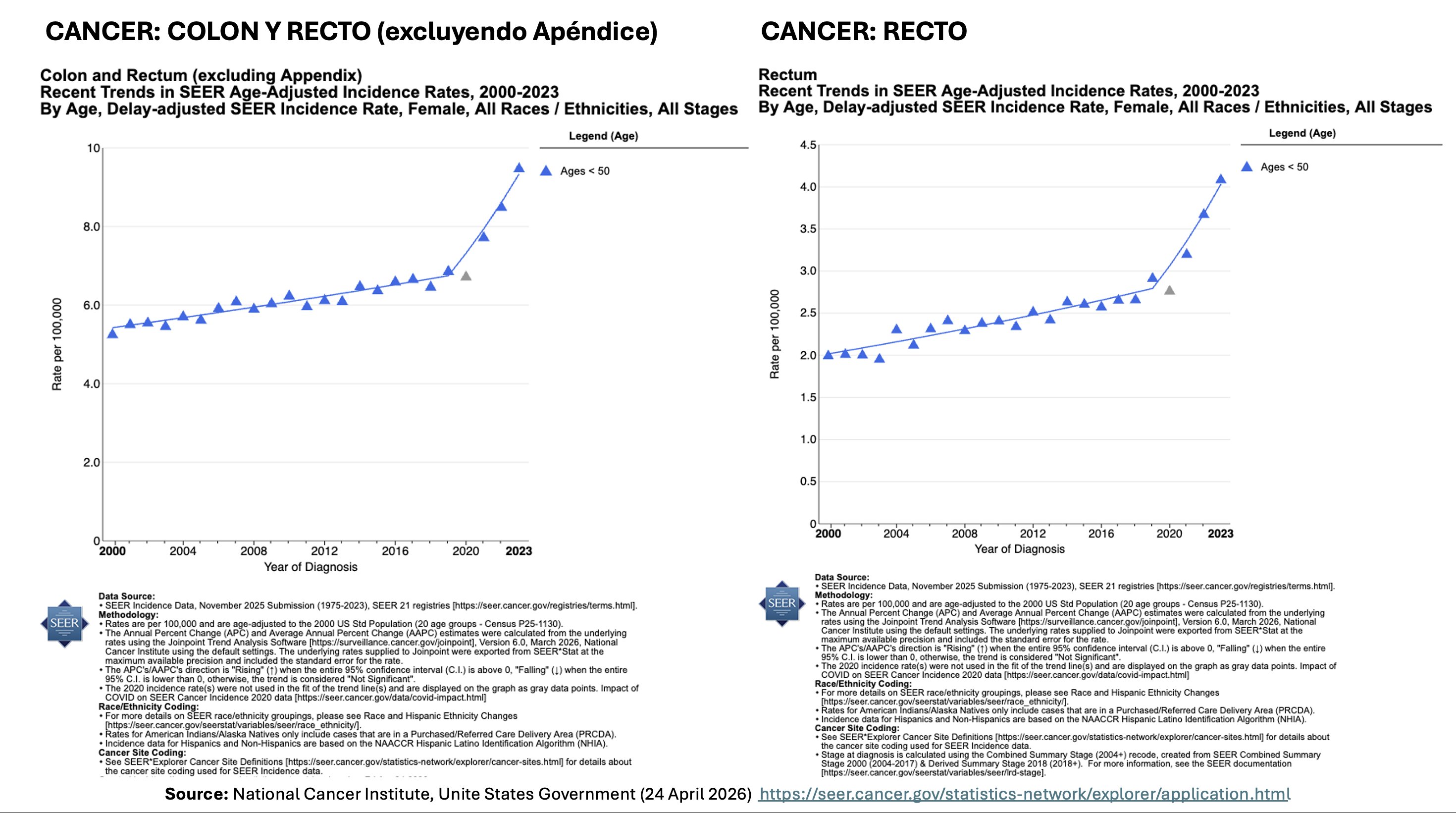 Ce que montrent vos graphiques (données SEER jusqu’en 2023)Cancer du côlon + rectum (femmes < 50 ans) : la courbe était en hausse lente/modérée depuis 2000.