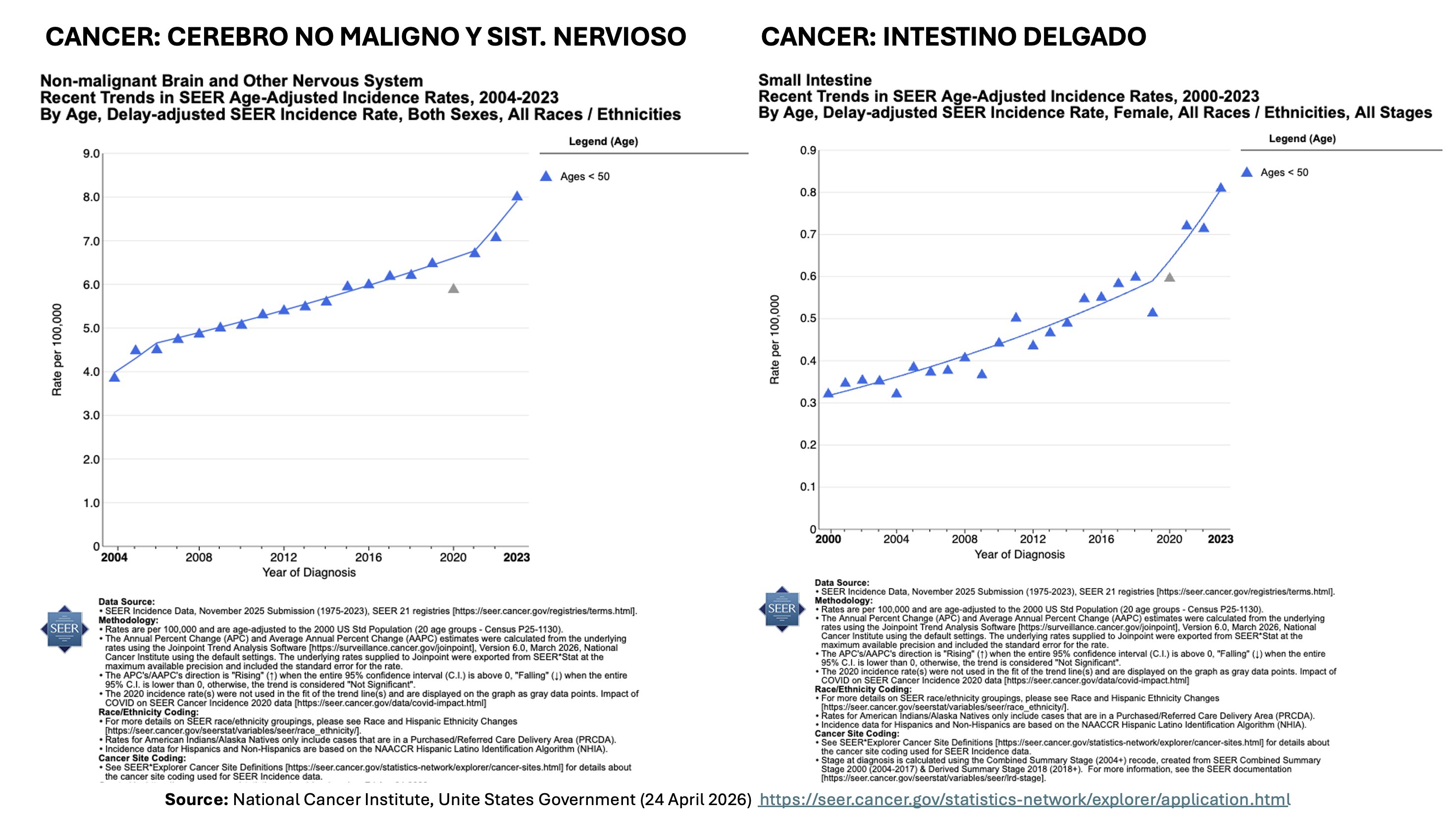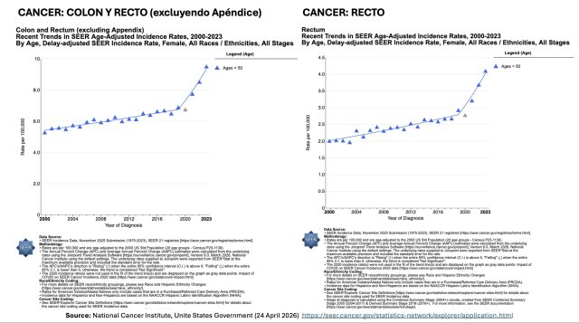 Les rapports officiels les plus récents (American Cancer Society 2025-2026 et SEER) reconnaissent que :Pour le cancer colorectal chez les < 50 ans, l’augmentation existait déjà depuis les années 1990-2000 (environ 1-2 % par an), mais elle s’est accélérée ces dernières années (jusqu’à ~3 % par an dans les 20-49 ans).