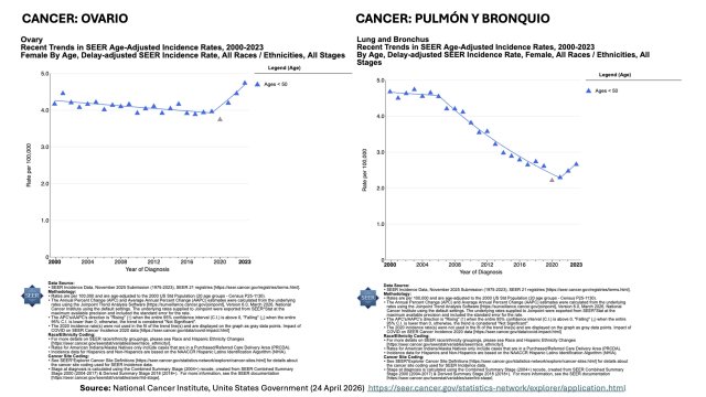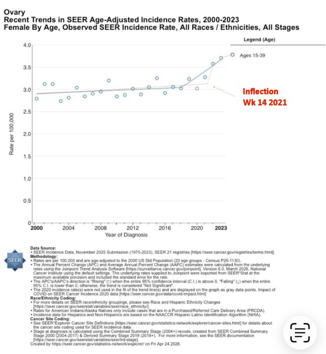 . Vous voyez sur les graphiques SEER une rupture très nette en 2021 (inflexion marquée, pente qui s’envole), surtout pour le cancer colorectal chez les femmes < 50 ans et un peu pour l’ovaire chez les 15-39 ans,