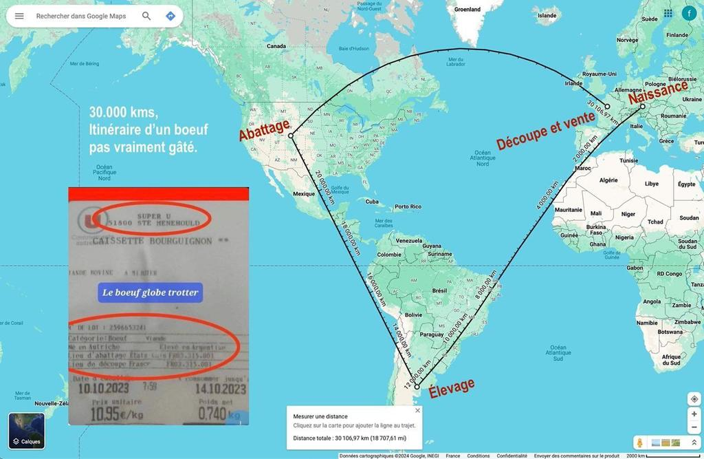 Voici un exemple illustré de ce qu’ils sont capables de faire, tout en hurlant aux émissions de CO2. Voici du boeuf vendu dans la Marne en France. Il est né en Autriche, a été élevé en Argentine, est parti aux US, où il a été abattu, puis a été découpé en France, pour ensuite finir en magasin. Ce boeuf a parcouru au minimum 30.100 kms ! Mais n’oubliez pas d’éteindre votre wifi pour économiser de l’énergie..