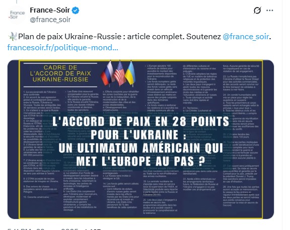 💥Suite à une grosse affaire de corruption en 🇺🇦, plusieurs centaines de millions $ d'aides occidentales ont disparu, les américains disposent de preuves pour contraindre Zelenski (qui est dans une très mauvaise passe), d'accepter un accord de paix de 28 points : neutralité de… pic.twitter.com/N1P5Dq2VHK