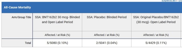mais ce vaccin n’a sauvé aucune vie lors des essais cliniques, ni le protocole à 2 doses administré à 20 000 participants, ni le rappel administré à 5 000 participants. De plus, les données initiales de l’essai clinique de Pfizer ne permettent pas d’espérer plus d’une vie sauvée sur 2 300.