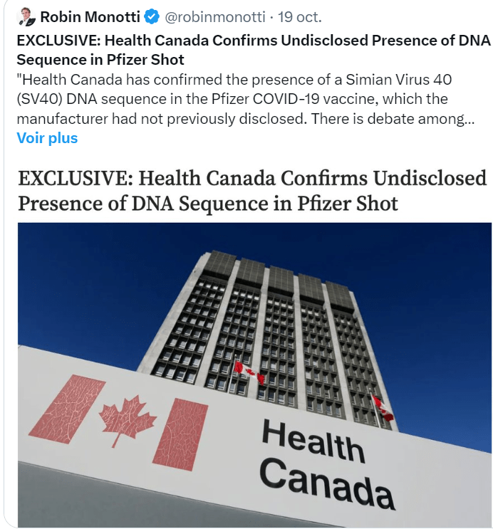 « Santé Canada a confirmé la présence d’une séquence d’ADN du virus simien 40 (SV40) dans le vaccin Pfizer contre la COVID-19, que le fabricant n’avait pas divulguée auparavant.