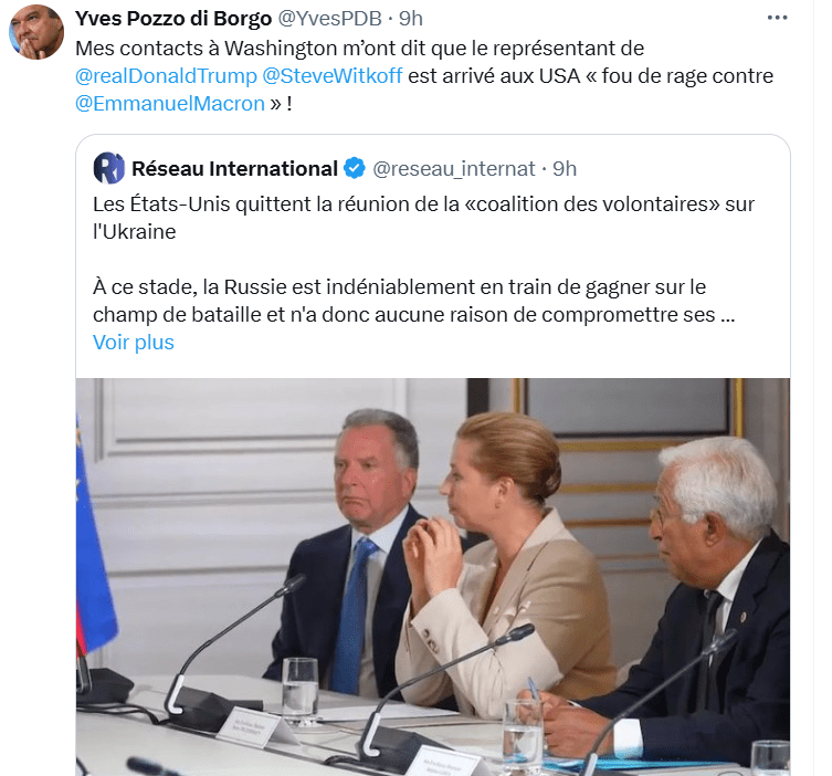 Selon l’Élysée, le représentant spécial américain Steve Witkoff s’est levé et a quitté la salle après seulement vingt minutes de réunion. Apparemment, le sujet était tellement irréaliste et intenable que Witkoff n’avait aucune raison de rester. Witkoff reviendra après que les Européens aient appelé le président Trump.
