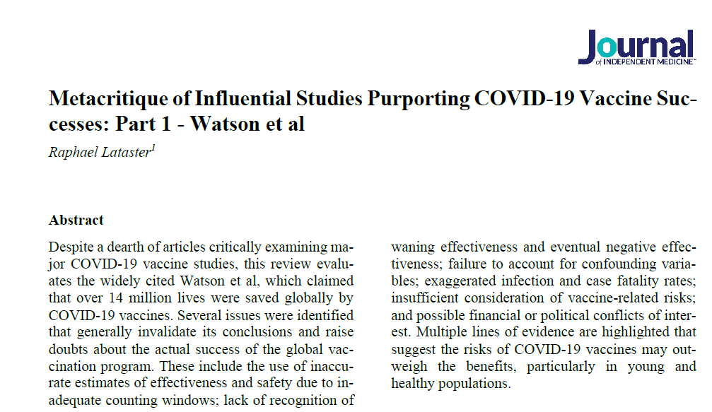 L’étude extrêmement influente sur les vaccins contre la COVID-19, Watson et al. , qui a été utilisée par les experts tout au long de la pandémie pour démontrer que les vaccins ont sauvé des dizaines de millions de vies en un an, a été complètement démystifiée , et la critique a finalement été publiée dans une revue médicale à comité de lecture . Ceci est la première d’une métacritique en trois parties de six études influentes sur les vaccins contre la COVID-19, avec des problèmes similaires identifiés tout au long. Les mêmes critiques s’appliqueraient à de nombreuses autres études.
