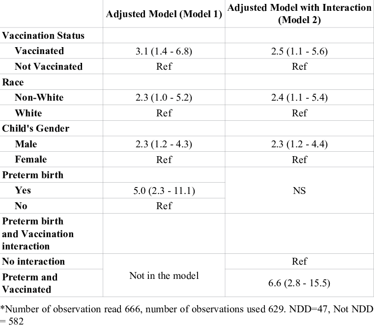 Cependant, dans un modèle ajusté final avec interaction, la vaccination mais pas la prématurité est restée associée au TND, tandis que l’interaction entre la prématurité et la vaccination était associée à une probabilité 6,6 fois plus élevée de TND (IC à 95 % : 2,8, 15,5).