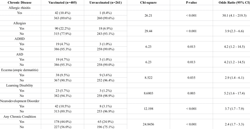 En conclusion, les enfants vaccinés scolarisés à domicile présentaient un taux plus élevé d’allergies et de TND que les enfants non vaccinés scolarisés à domicile.