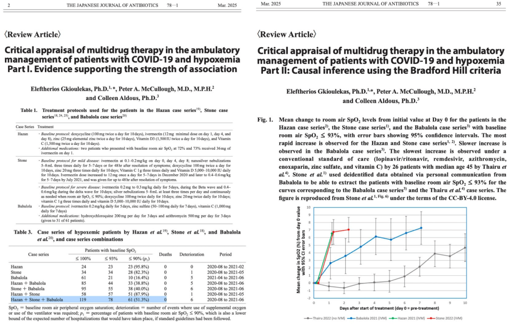 L’étude financée par la Fondation McCullough, dirigée par le mathématicien Dr Eleftherios Gkioulekas, intitulée Évaluation critique de la thérapie multidrogue dans la gestion ambulatoire des patients atteints de COVID-19 et d’hypoxémie , vient d’être publiée après un examen par les pairs réussi en deux parties dans The Japanese Journal of Antibiotics :