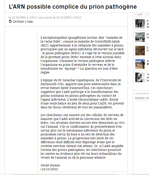 En 2003, un article de Sciences et Avenir indiquait que l’ARN participe à la transformation des prions normaux en prions pathogènes et accélère la survenue des maladies à prion.