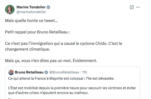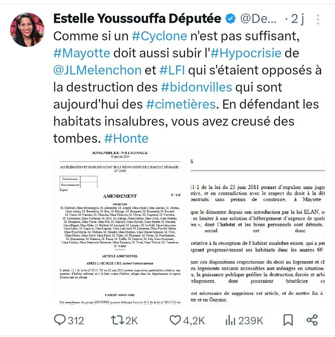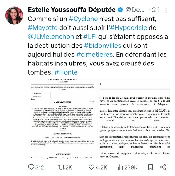 La gauche, LFI en particulier est responsable de cette catastrophe à Mayotte par le refus de supprimer les bidonvilles et contrôler l’immigration !
