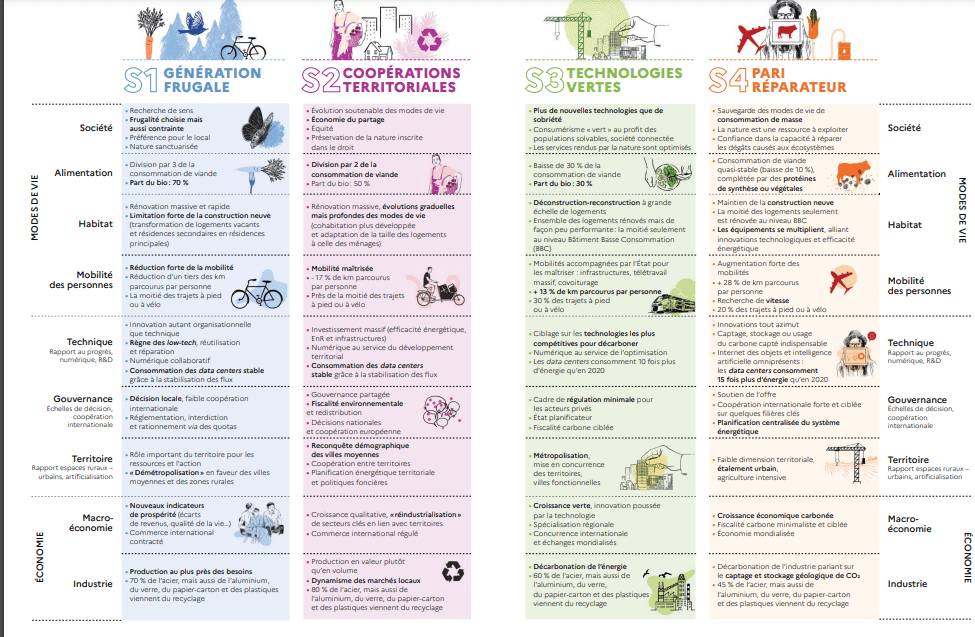 S4, le seul qui renonce à ce levier, conduit à une fuite en avant qui paraît risquée : faute de pouvoir décarboner l’énergie, la société est réduite à dépenser d’énormes quantités d’énergie pour extraire le CO₂ de l’air ambiant. Le pari technologique et économique est énorme. S3, qui se place dans la prolongation de nos habitudes actuelles, mise sur les technologies pour augmenter le potentiel de l’efficacité énergétique, pour pouvoir se contenter d’une sobriété modérée. Cela suppose l’atteinte effective de l’équilibre entre développement de ces technologies et augmentation desconsommations. Mais le temps de développement de ces technologies retarde la diminution des émissions, conduisant à un solde global d’émission important sur la période de transition.